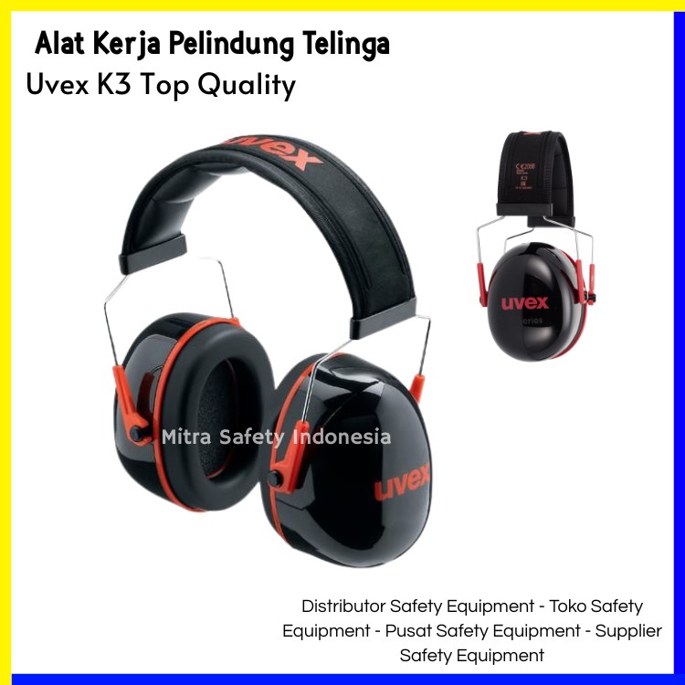 Earmuff safety uvex k3 alat pelindung telinga (hearing protection device) yang berfungsi untuk melindungi pendengaran dari paparan kebisingan berlebih di lingkungan kerja. Alat ini terdiri dari dua cup (penutup telinga) yang dilapisi bantalan lembut dan dihubungkan oleh headband yang dikenakan di atas atau di belakang kepala. Earmuff bekerja dengan menutup seluruh daun telinga secara rapat, sehingga menghalangi gelombang suara masuk langsung ke saluran telinga.