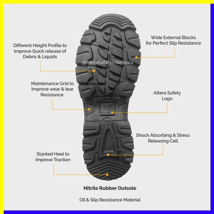 Upper (bagian atas) dibuat dari kulit full-grain asli atau material kulit berkualitas tinggi, Sol luar (outsole) sepatu safety altera bromo menggunakan material premium seperti nitrile rubber premium grade yang tahan minyak (oil resistant) dan anti slip untuk meningkatkan keamanan pada permukaan licin, Pelindung ujung kaki (toe cap) dan kemungkinan pelindung tusuk di bagian bawah (mid-sole) untuk model industri, Insole bagian dalam yang bernapas (untuk menjaga kaki tetap kering dan nyaman. Juga sepatu di toko safety ini sudah memiliki standar keselamatan kerja (SNI) Standar Nasional Indonesia (CE) Standar Eropa