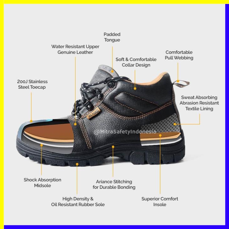 - Proteksi maksimal untuk kaki dari risiko benturan, tekanan, tusukan, dan terpeleset